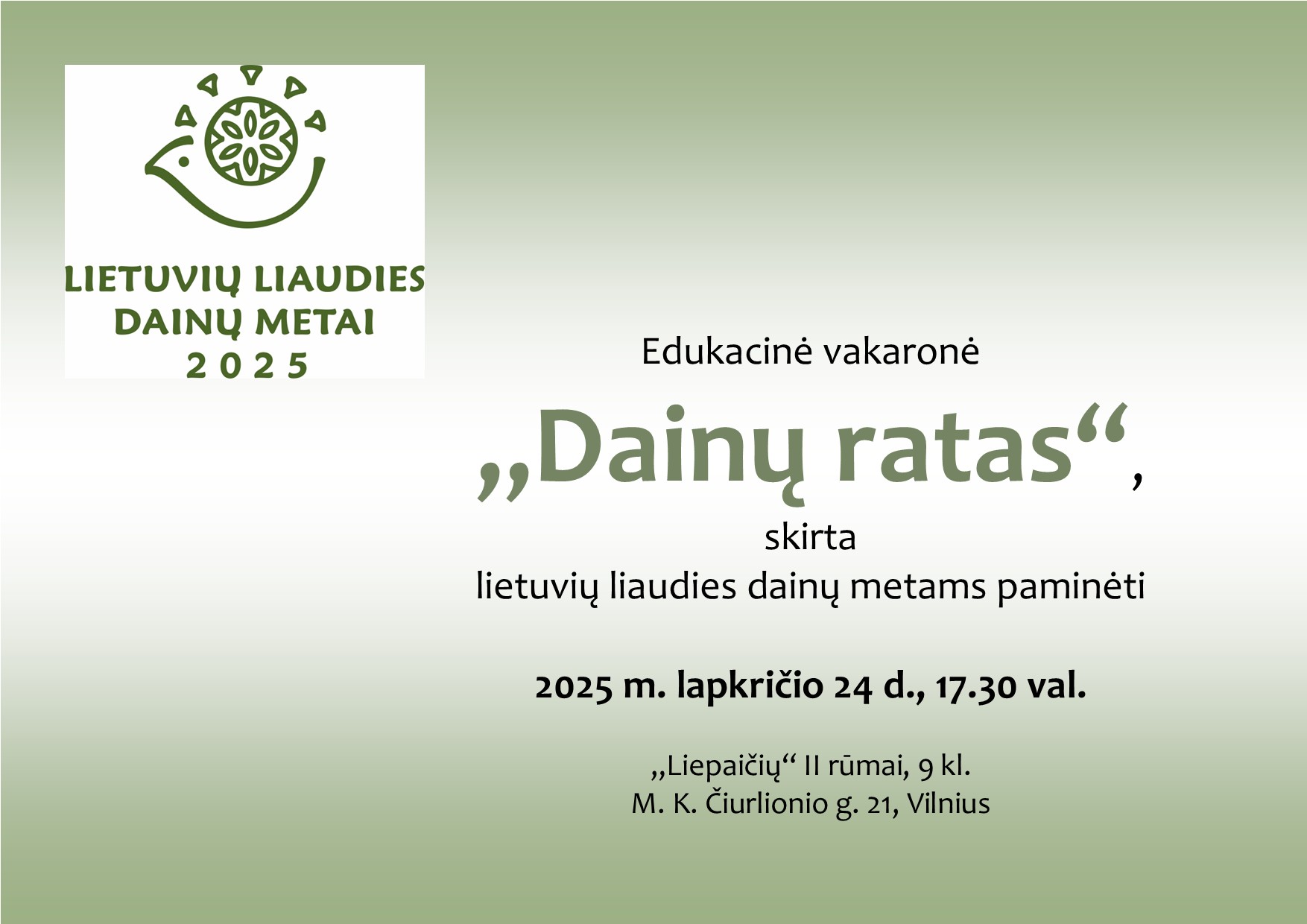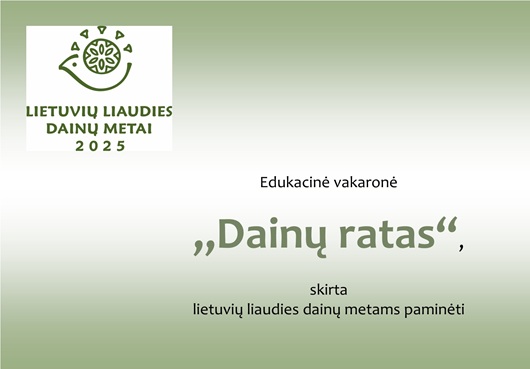 Edukacinė vakaronė „Dainų ratas“, skirta lietuvių liaudies dainų metams paminėti, vyks 2025 m. lapkričio 24 d., 17.30 val. „Liepaičių“ II rūmų 9 klasėje. Afiša.