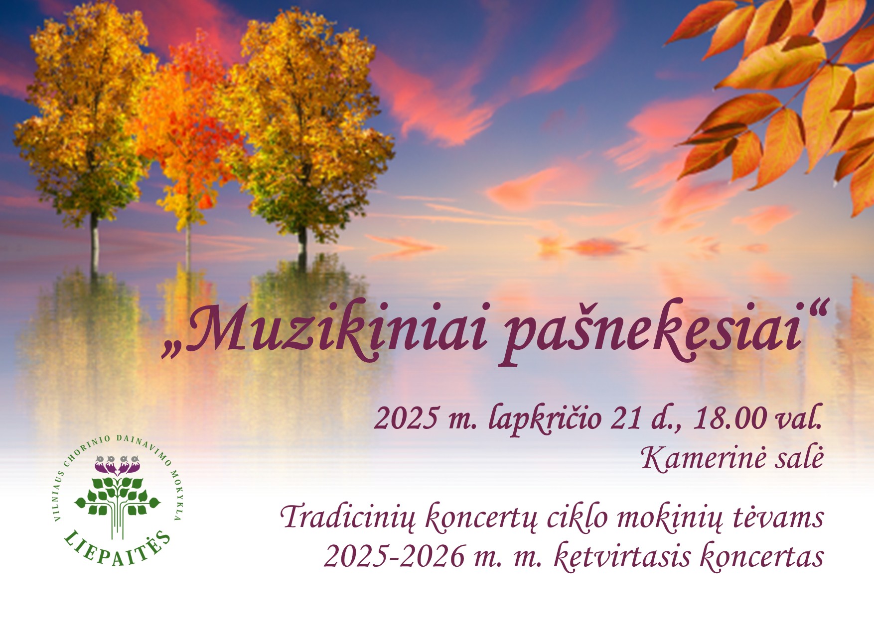 Lapkričio 21 d., 18.00 val. Vilniaus chorinio dainavimo mokyklos „Liepaitės“ Kamerinėje salėje vyks jau ketvirtasis „Muzikinių pašnekesių“ koncertas. Šis koncertų ciklas skirtas pristatyti talentingų mokinių pasirodymus, atskleidžiant jų muzikinį meistriškumą ir kūrybiškumą.