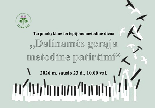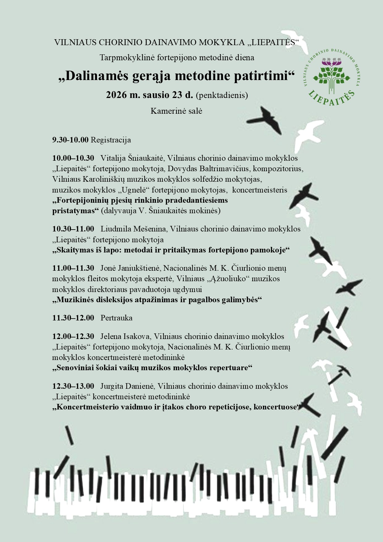 2026 m. sausio 23 d., 10.00 val. vyks metodinė diena „DALINAMĖS GERĄJA METODINE PATIRTIMI“ Vilniaus chorinio dainavimo mokykloje „Liepaitės“, Kamerinėje salėje (P. Skorinos g. 14, Vilnius). Afiša.