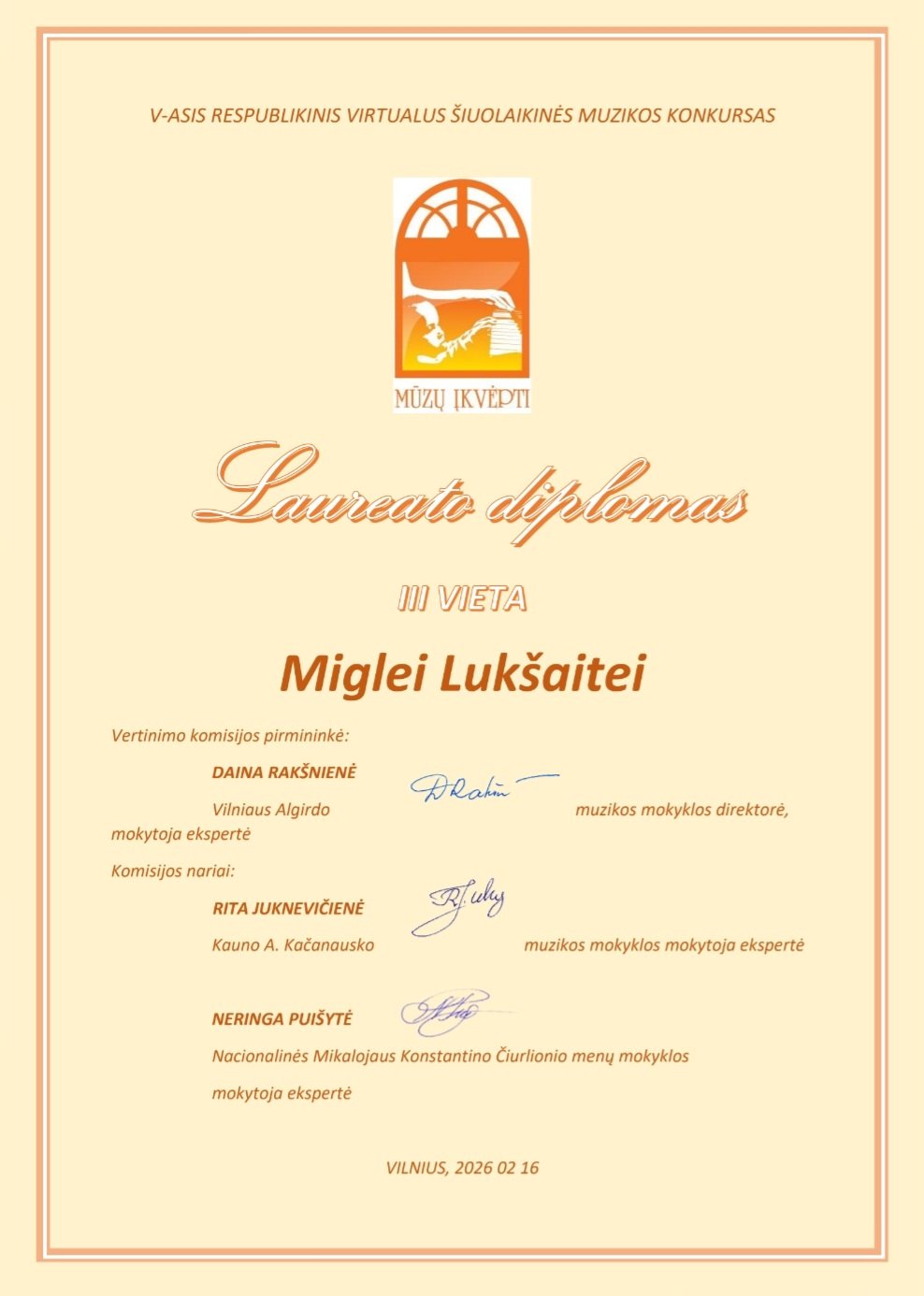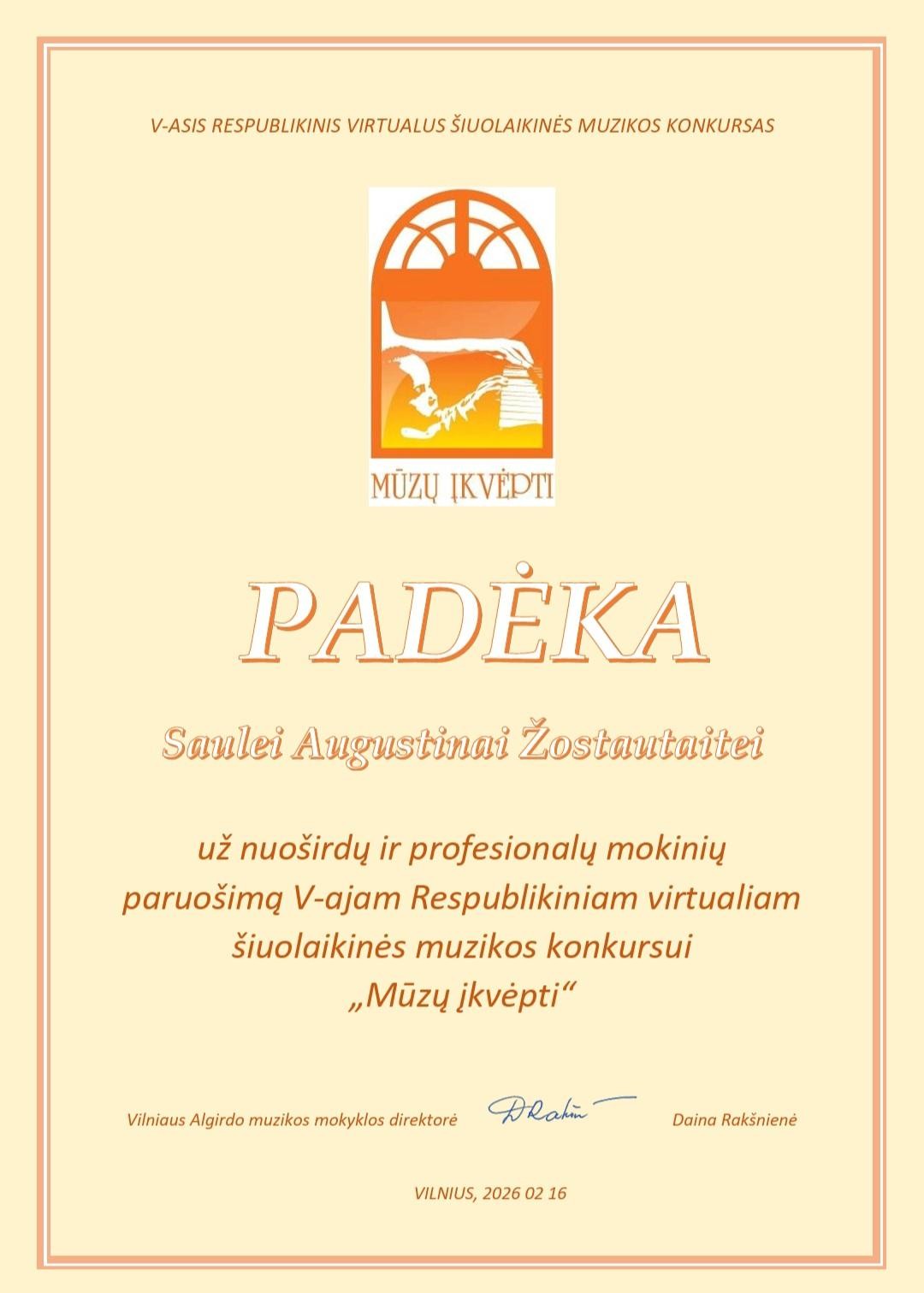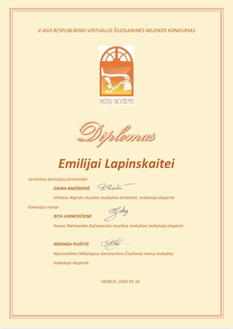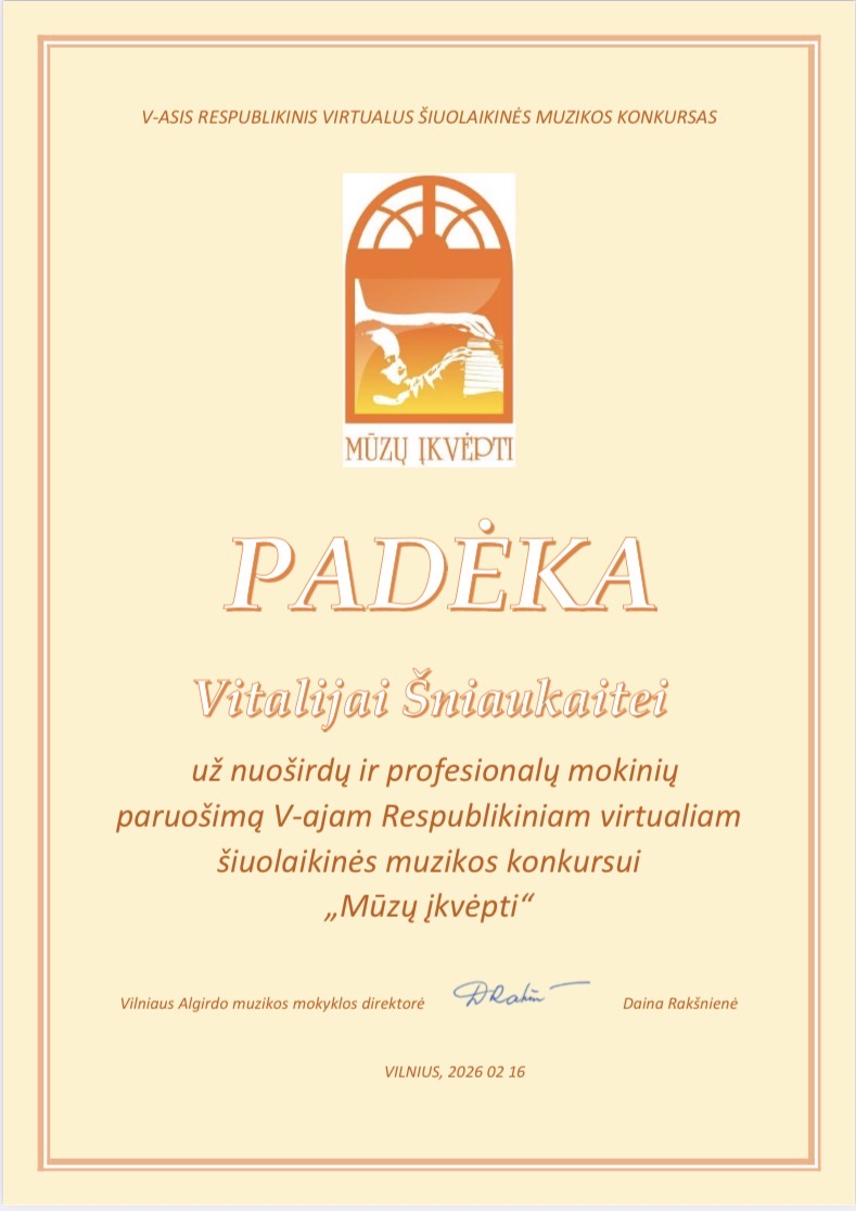 2026-02-16 Sveikiname V respublikinio virtualaus šiuolaikinės muzikos konkurso „MŪZŲ ĮKVĖPTI“ laureates: Jorę Indriūnaitę (3 kl.) ir Godą Glemžaitę (8 kl.), laimėjusias II vietos laureato diplomą, jų fortepijono mokytoją Saulę Augustiną Žostautaitę; Beatričę Jasaitytę (7 kl.), laimėjusią II vietos laureato diplomą, Miglę Lukšaitę (6 kl.), laimėjusią III vietos laureato diplomą, jų fortepijono mokytoją Dangyrą Navikaitę-Lukoševičienę; Upę Paulauskaitę (1 kl.), laimėjusią III vietos laureato diplomą, Emiliją Lapinskaitę (8 kl.), pelniusią diplomą, ir jų fortepijono mokytoją Vitaliją Šniaukaitę. Džiaugiamės kartu su jumis! |