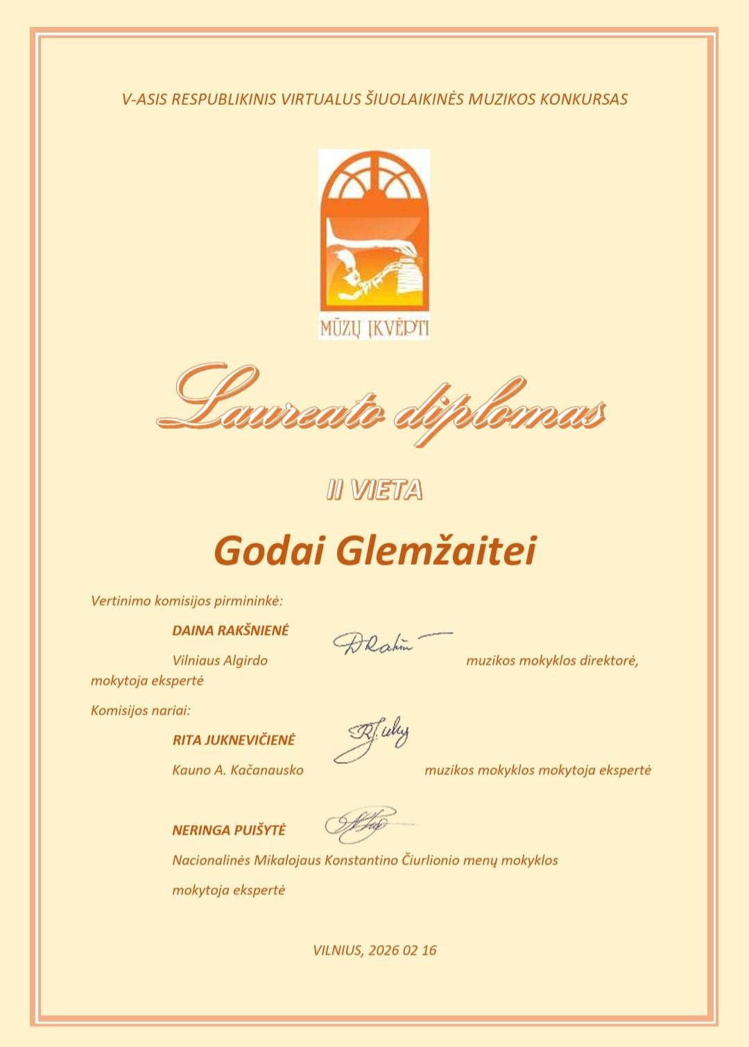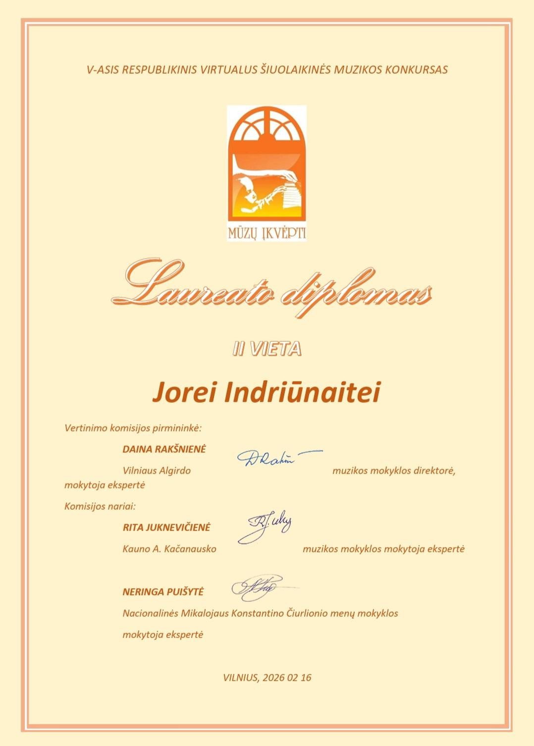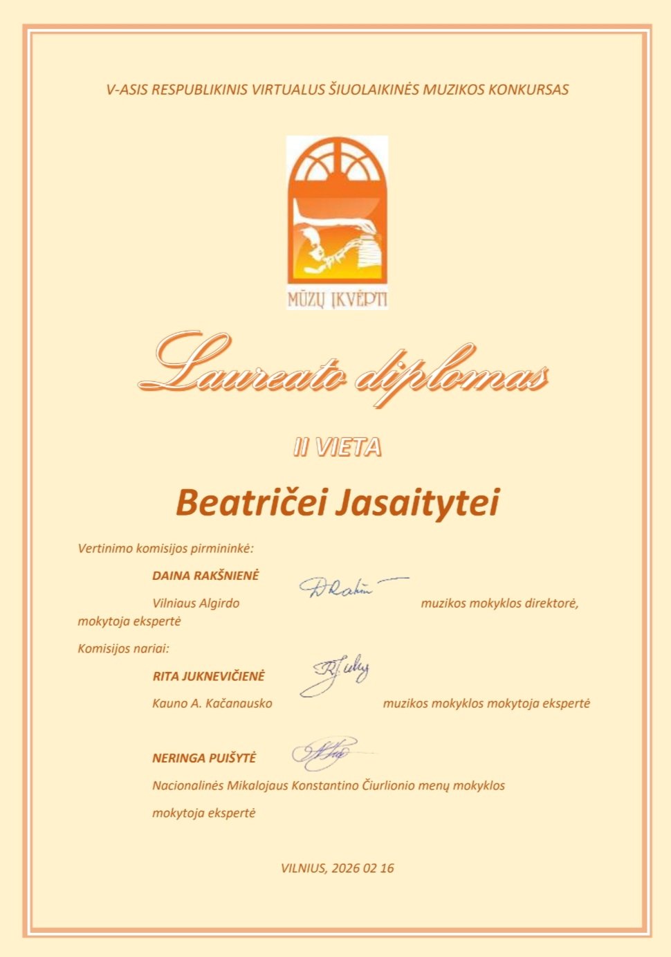 2026-02-16 Sveikiname V respublikinio virtualaus šiuolaikinės muzikos konkurso „MŪZŲ ĮKVĖPTI“ laureates: Jorę Indriūnaitę (3 kl.) ir Godą Glemžaitę (8 kl.), laimėjusias II vietos laureato diplomą, jų fortepijono mokytoją Saulę Augustiną Žostautaitę; Beatričę Jasaitytę (7 kl.), laimėjusią II vietos laureato diplomą, Miglę Lukšaitę (6 kl.), laimėjusią III vietos laureato diplomą, jų fortepijono mokytoją Dangyrą Navikaitę-Lukoševičienę; Upę Paulauskaitę (1 kl.), laimėjusią III vietos laureato diplomą, Emiliją Lapinskaitę (8 kl.), pelniusią diplomą, ir jų fortepijono mokytoją Vitaliją Šniaukaitę. Džiaugiamės kartu su jumis! |