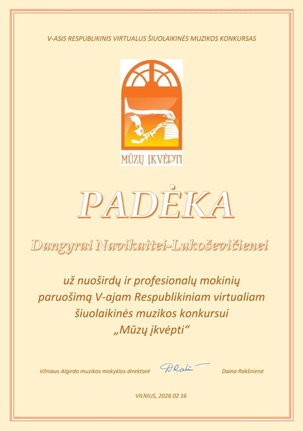 2020-12-04 Sveikiname II-ojo tarptautinio Vytauto Mikalausko jaunųjų pianistų konkurso diplomantę 8 klasės mokinę Urtę Gadeikytę ir jos mokytoją Dangyrą Navikaitę-Lukoševičienę. Džiaugiamės kartu su Jumis! Virtualų konkursą, skirtą fortepijono pedagogų ir mokinių domėjimuisi kompozitoriaus V. Mikalausko fortepijonine kūryba, fortepijoninio muzikavimo tradicijų propagavimui, mokinių kūrybiškumo ir meninės iniciatyvos skatinimui, organizavo Panevėžio Vytauto Mikalausko menų gimnazija. Plačiau. Diplomas Urtei Gadeikytei |