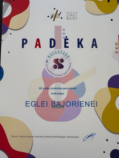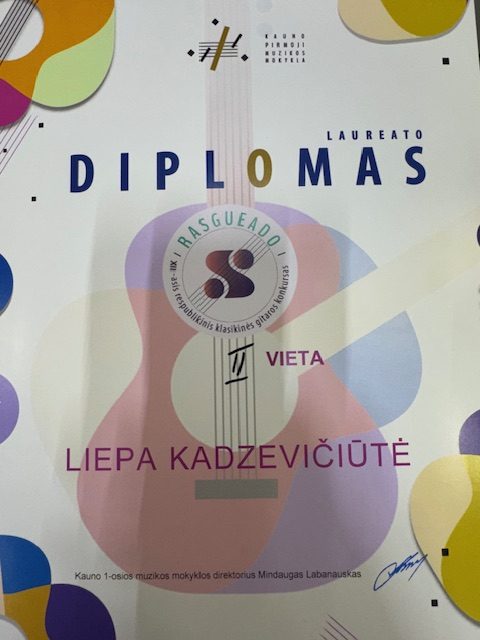 2023 02 25 Sveikiname Rūtą Vaškevičiūtę 4 klasės mokinę IX respublikiniame klasikinės gitaros konkurse „Rasgueado“ laimėjusią Grand Prix (Diplomas), I vietos diplomą (Diplomas) ir nominaciją (Nominacija) už geriausiai atliktą pjesę ir jos mokytoją Eglę Bučniūtę. Džiaugiamės kartu su Jumis! Konkursą organizavo Kauno 1-oji muzikos mokykla. |