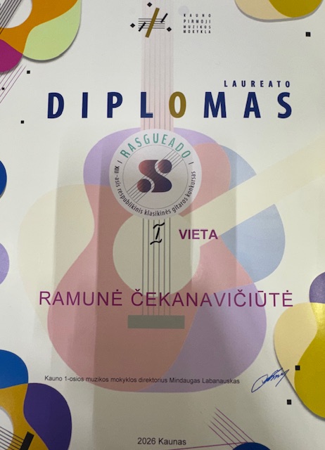 2026-02-28 Sveikiname XII respublikinio klasikinės gitaros konkurso „Rasgueado“ 2026 laureates: Ramunę Čekanavičiūtę (7 kl.), laimėjusią I vietos laureato diplomą, Liepą Kadzevičiūtę (7 kl.), laimėjusią II vietos laureato diplomą, Mariją Mosinaitę (3 kl.), laimėjusią III vietos laureato diplomą, jr jų gitaros mokytoją Eglę Bajorienę. Džiaugiamės kartu su jumis! |