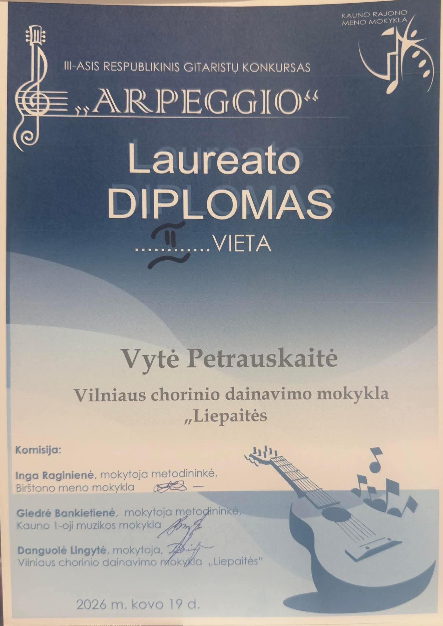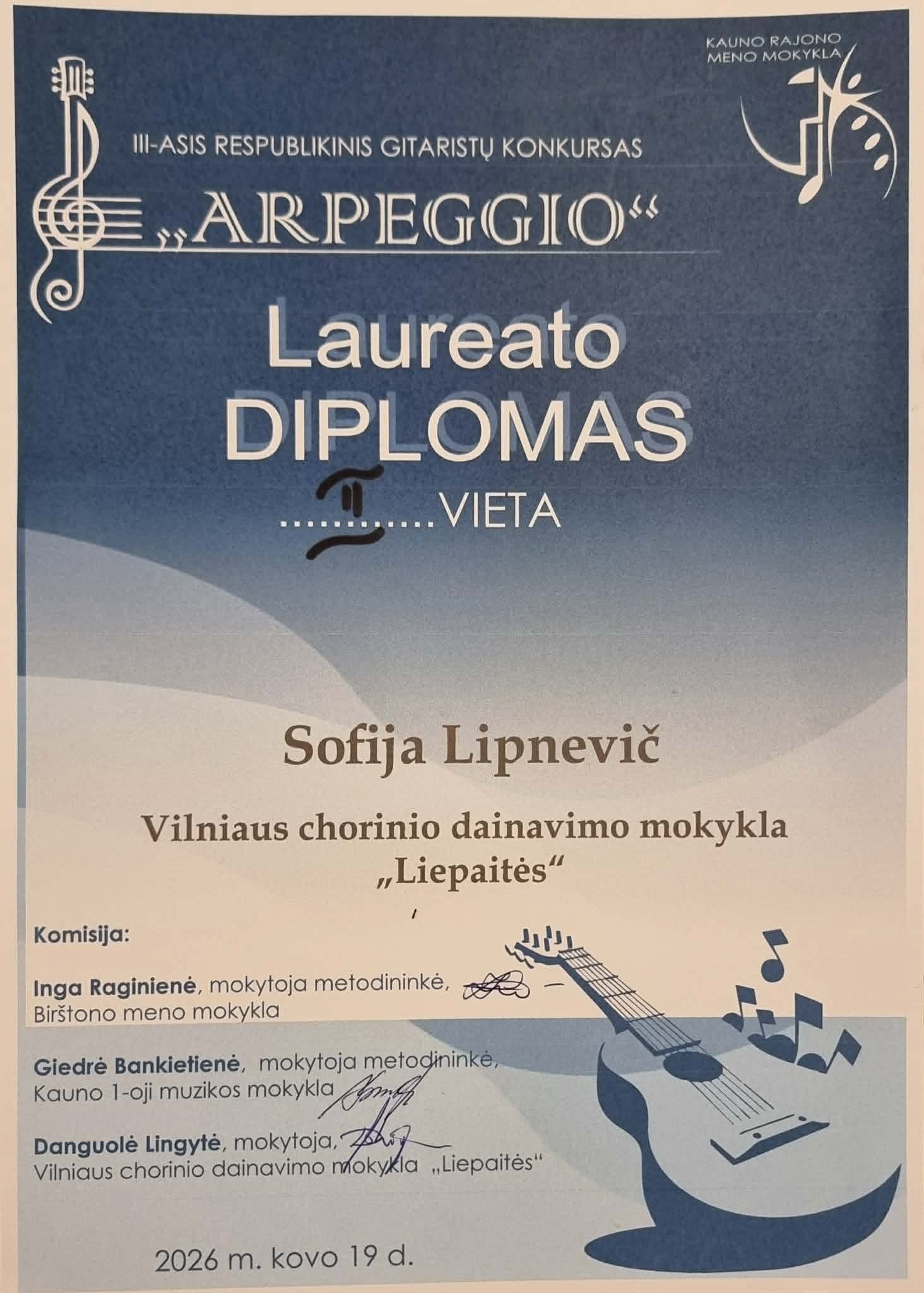 2026-03-19 Sveikiname III-ojo respublikinio klasikinės gitaros konkurso „ARPEGGIO“ II vietos laureates – A grupėje (solo) 2 klasės mokines Sofią Lipnevič ir Vytę Petrauskaitę, jų mokytoją Danguolę Lingytę. Džiaugiamės kartu su Jumis! |