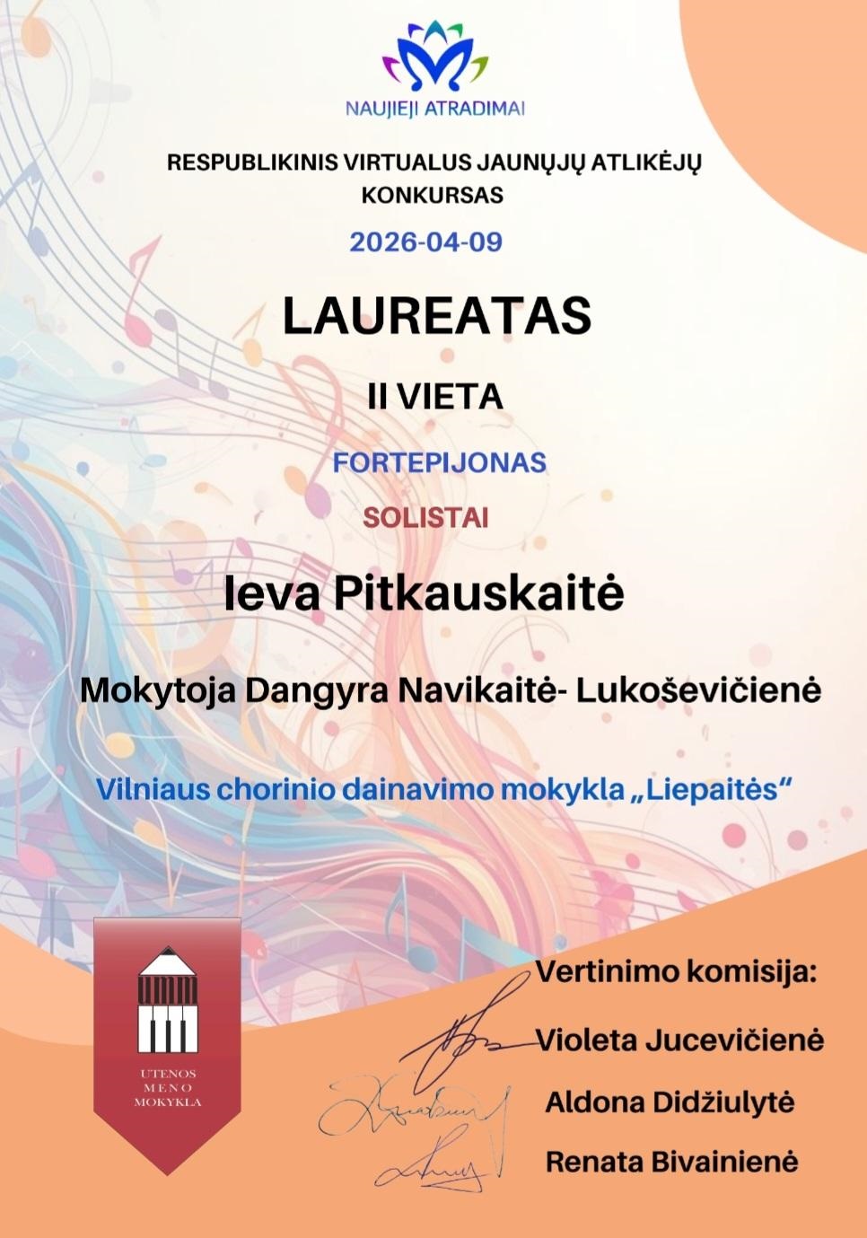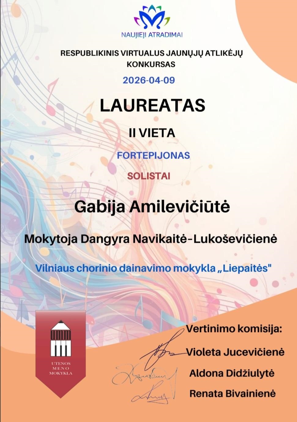 2026-04-09 Respublikinio virtualaus jaunųjų atlikėjų konkurso „Naujieji atradimai“ I vietos laureates fortepijono papildomo instrumento grupėje Sofiją Bernatonytę (4 kl.), Godą Gelažauskaitę (7 kl.), Izabelę Krupoviesaitę (8 kl.) jų mokytoją Saulę Augustiną Žostautaitę. II vietos laureates fortepijono solo instrumento grupėje Ievą Pitkauskaitę (5 kl.), Gabiją Amilevičiūtę (9 kl.) jų mokytoją Dangyrą Navikaitę-Lukoševičienę. Džiaugiamės kartu su Jumis! |